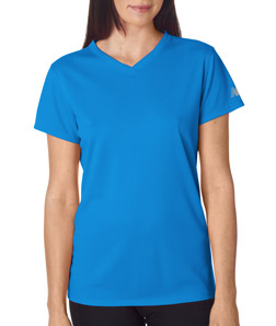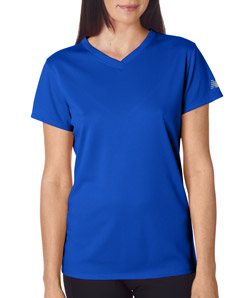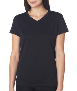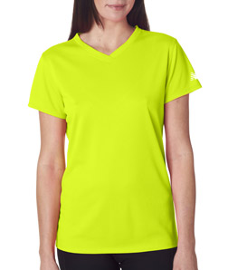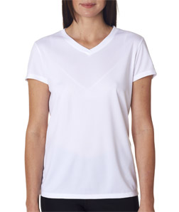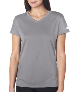 Design ladies personalized New Balance v-neck wicking t-shirts at Impressionz Printing. Create your own custom dri fit performance workout shirts for girls.